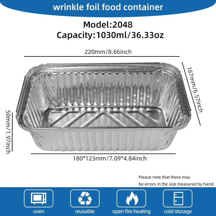 Yunchu Alüminyum Folyo Fabrikasının tek kullanımlık barbekü pişirme öğle yemeği kutusu gümüş alüminyum folyo kabı, yüksek saflıkta gıda sınıfı alüminyum folyodan yapılmıştır. Toksik değildir ve tatsızdır, yüksek sıcaklığa ve düşük sıcaklığa dayanıklıdır. Erime noktası 250°C kadar yüksektir. Gıda ile doğrudan temas halinde olabilir. Yüksek sıcaklıklarda ısıtıldığında zararlı madde yaymaz. Ayrıca soğutulduğunda ve dondurulduğunda stabil şeklini koruyabilir. Tek kullanımlık bir tasarımdır ve kullanımdan sonra atılabilir. Tabakları ve fırın tepsilerini temizlemek için zaman harcamanıza gerek yok, tamamen toksinlerden arındırıyor. Yemeklerden sonra can sıkıcı temizlik sorununu çözer ve özellikle çok sayıda kişinin bulunduğu toplantılar ve açık havada seyahat gibi sahneler için uygundur. Yükseltilmiş kalınlaştırılmış alüminyum folyo malzemesi sağlam bir dokuya ve güçlü bir destek kapasitesine sahiptir. Çorba veya ağır barbekü malzemeleri içeren tabakları tutarken sızıntı yapmak veya deforme olmak kolay değildir. Kenarlar pürüzsüz ve çapaksızdır, bu da kullanımı daha güvenli hale getirir. Ayrıca fırınlar, fritözler, buharlı pişiriciler ve diğer mutfak gereçleri için de uygundur ve pişirme ve servis tek adımda yapılabilir.