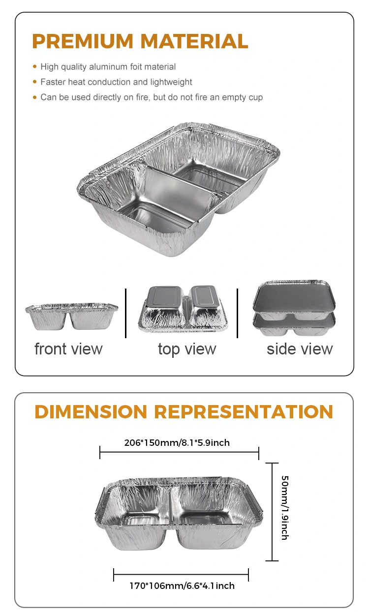 Bu tek kullanımlık bölme fast food gümüş alüminyum folyo kaplarının açılış boyutunun yiyecekleri içeri ve dışarı koymak kolaydır. Yiyecek servis ederken, daha büyük açıklık mutfak personelinin hızlı ve yüksek kaliteli kızartılmış yemekler ve diğer ürünler dökmesine izin verir ve yemek yaparken tüketicilerin yemek çubukları veya çatallarla yiyecek almak gibi kullanması da kolaydır. Bu tasarım yüksekliği, yeterli gıda kapasitesi sağlarken öğle yemeği kutusunun stabilitesini sağlayabilir ve ulaşım veya yerleşim sırasında aşırı yükseklik nedeniyle kolayca dökülmeyecek, içerideki yiyecekleri dökülmeden etkili bir şekilde koruyacak.