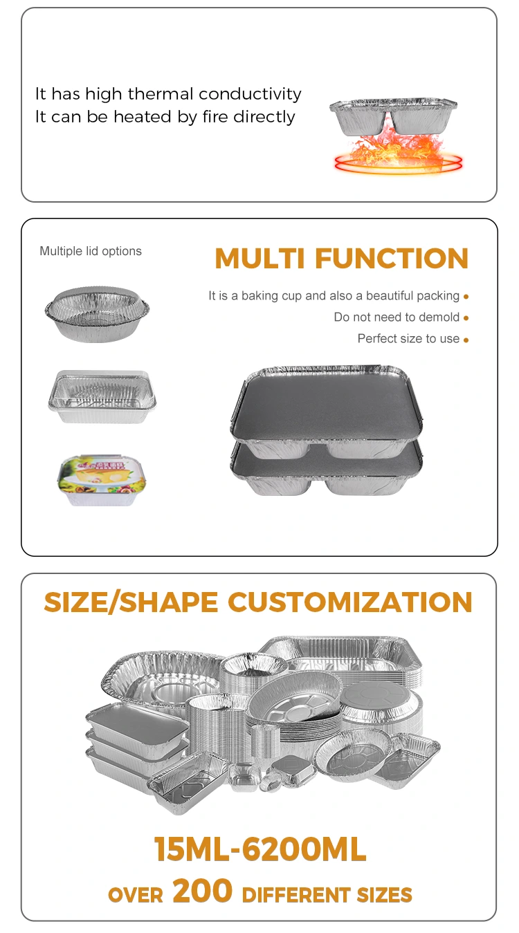 Yunchu alüminyum folyo tedarik fabrikasının tek kullanımlık bölmesi fast food gümüş alüminyum folyo kapları modeli 75600, üst çap 206 mm (8.1 inç), 150 mm (5.9 inç), alt çap 170 mm (6.6 inç), 106 mm (4.1 inç) ve yükseklik 50 mM (1.9 inç). Kapasite yaklaşık 860 ml'dir (30.3 oz). Bu alüminyum folyo öğle yemeği kutusu sadece mükemmel bir ısı tutulması değil, aynı zamanda alüminyum folyo kapağı ile eşleştirilebilir. Ayrıca, müşteri belleğini derinleştirmek ve marka bilinirliğini artırmak için özelleştirilmiş logo hizmetleri de sunuyoruz.