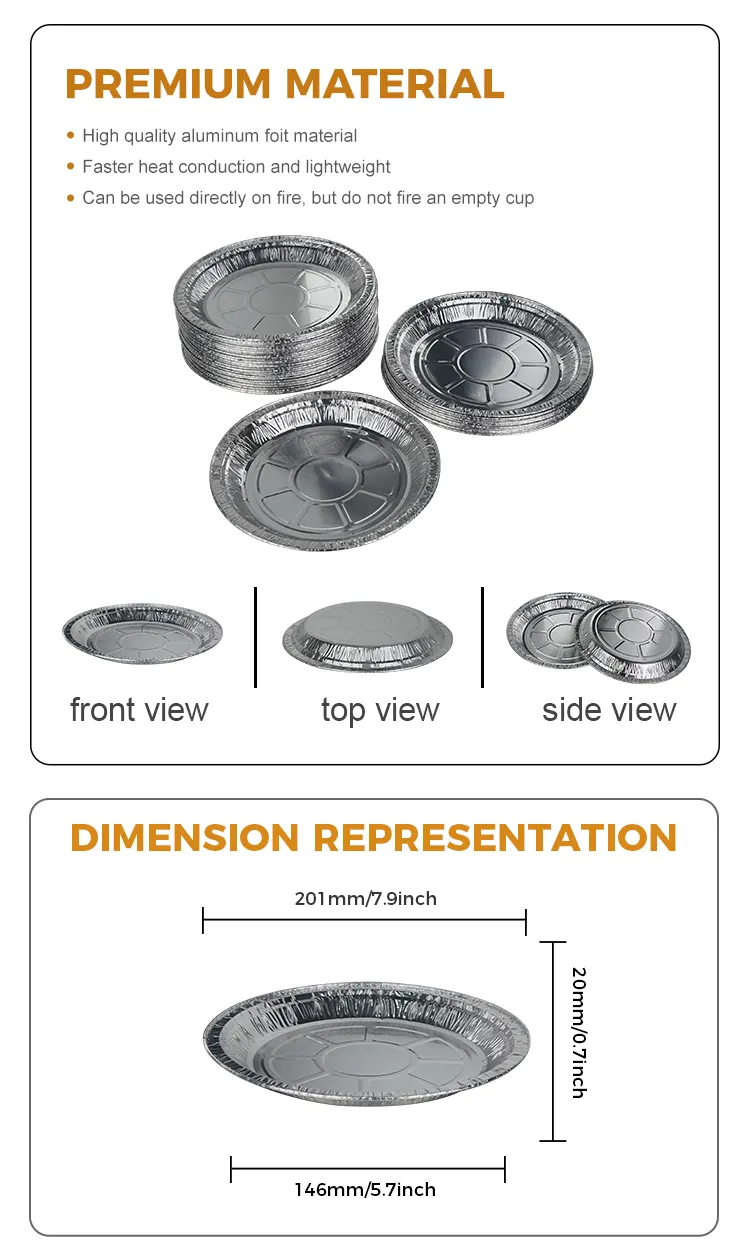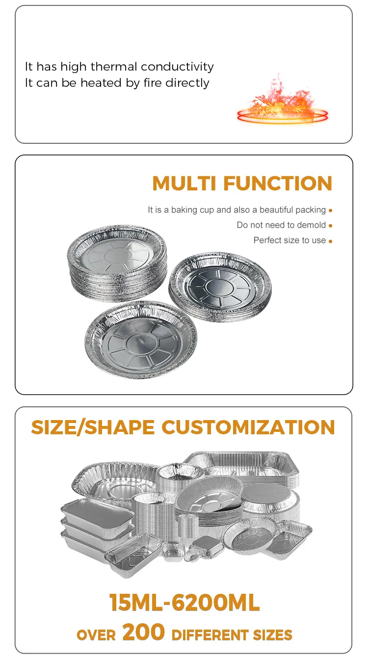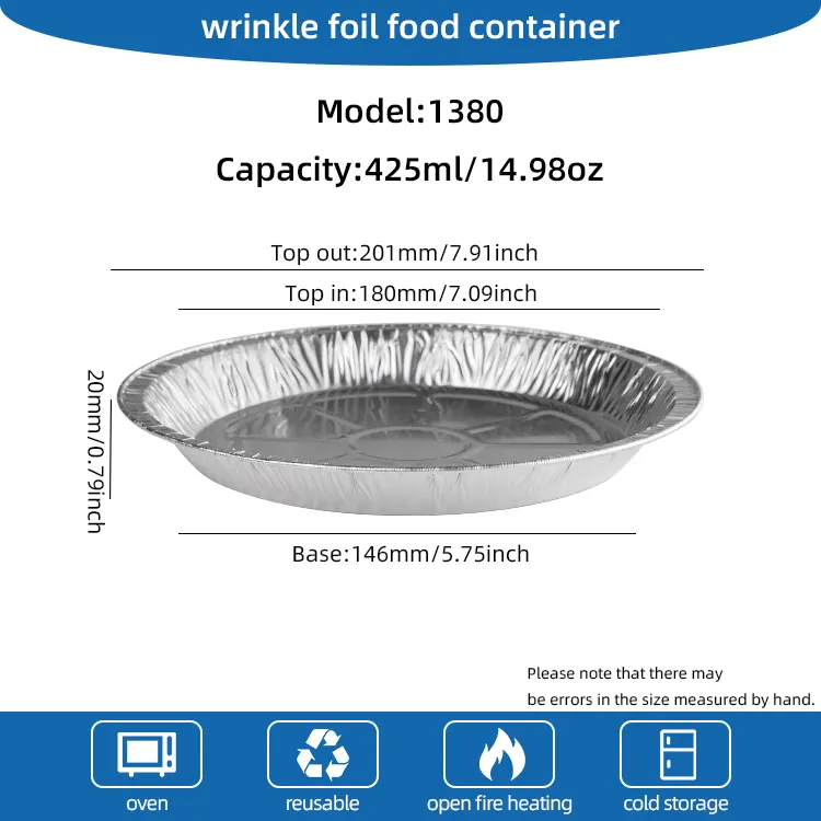 Yunchu Alüminyum Folyo Tek Kullanımlık Diskli Hava Fritözü Gümüş Alüminyum Folyo Kabı hem hijyenik hem de çevre dostudur. Kolayca deforme olmayan, gıda ile doğrudan temas edebilen, kalınlaştırılmış ve korozyona dayanıklı malzemelerden yapılmıştır. Yüksek sıcaklıklardan korkmaz, yanmaz, yakılmaz ve çöpe atılması kolay değildir. 250°C'ye kadar yüksek sıcaklıklara dayanabildiğinden yüksek sıcaklıkta pişirme, fırında, mangal gibi çeşitli pişirme yöntemlerine uygun olduğundan endişelenmenize gerek yok. Farklı boyutlardaki çeşitlendirilmiş pişirme ihtiyaçlarını karşılamak için çok sayıda spesifikasyon mevcut olup, çeşitli gıda üretimi gereksinimleriyle kolayca başa çıkmanıza olanak tanır.