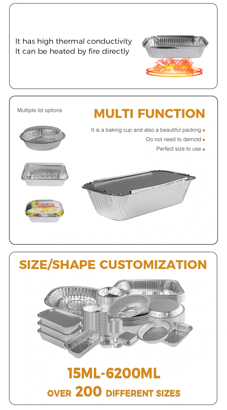 Bu tek kullanımlık fast food kutusu barbekü gümüş alüminyum folyo kaplar, iyi bir ısı koruma etkisine sahip olan ve gıdaların sıcaklığını koruyabilen ve yiyecekleri daha lezzetli ve lezzetli hale getirebilen yüksek kaliteli 8011 alüminyum folyo malzemeden yapılmıştır. Buna ek olarak, dikdörtgen Barbekü gümüş alüminyum folyo kabımız ayrıca, özelleştirilmiş logo için uygun olan ve marka imajını daha da geliştiren alüminyum folyo kapak veya PET plastik kapak ile eşleştirilebilen bir termal yalıtım fonksiyonu ile donatılmıştır.