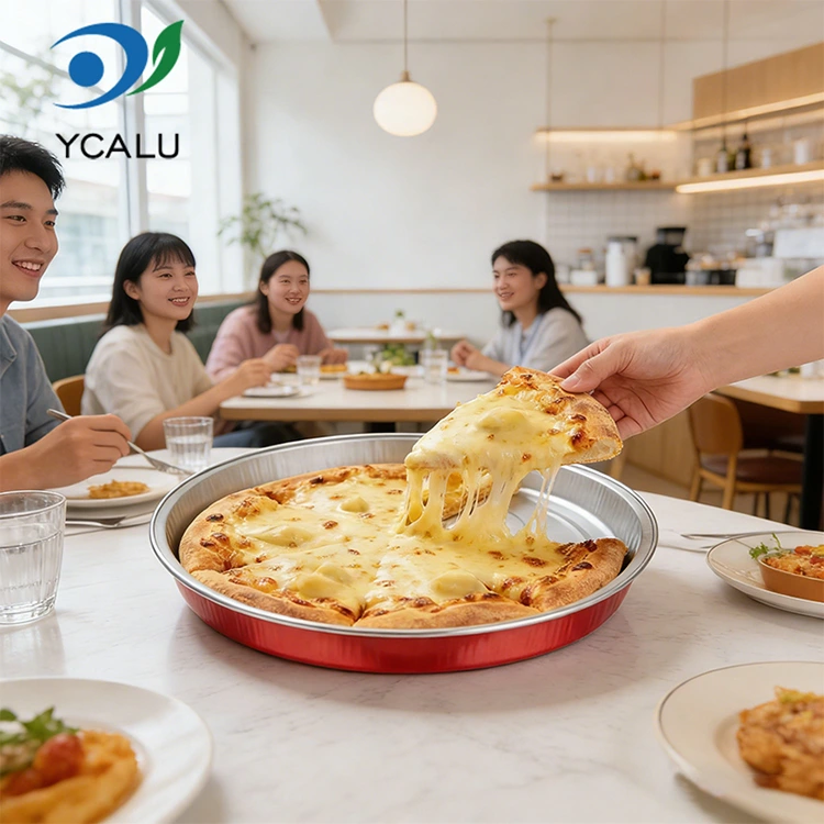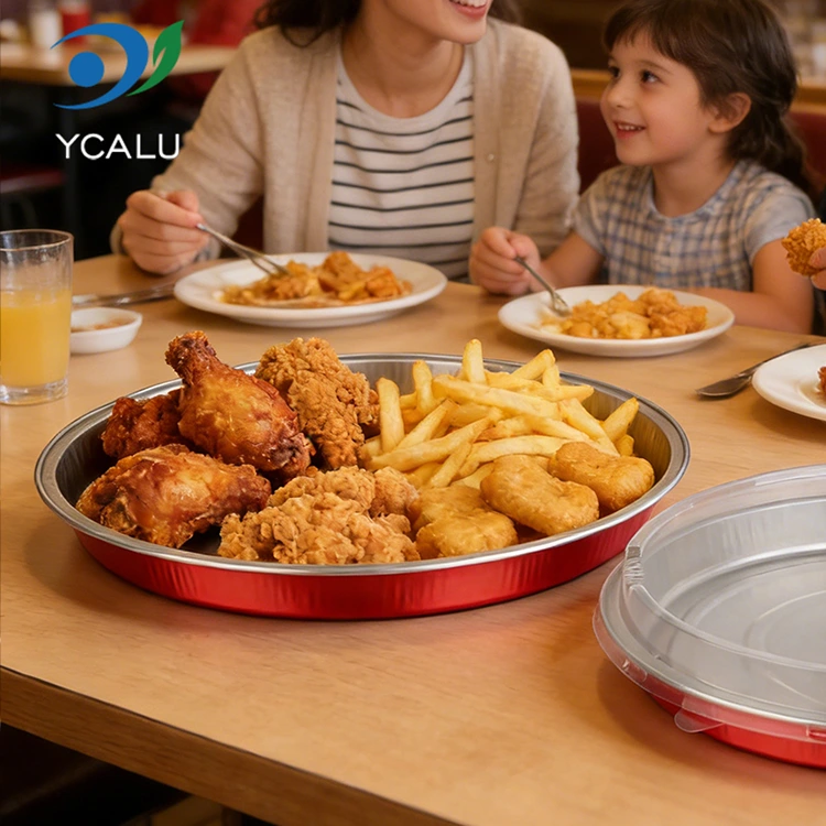 Yunchu Alüminyum Folyo Tedarikçisi C900 Tek Kullanımlık Pizza Tavası Ambalajı Yuvarlak Alüminyum Folyo Kabı, gıdaya uygun ham alüminyum folyodan yapılmıştır, kokusuz ve yabancı maddeler içermez, gıdalara güvenle dokunmayı güvenli kılar. Kalınlığı düzgün ve sağlamdır ve 250°C'ye kadar yüksek sıcaklıklara ve -20°C'ye kadar düşük sıcaklıklara dayanabilir. Taze sıcak pizza doğrudan servis edilebilir. Kabı değiştirmeden buzdolabında saklanabilir ve taze tutulabilir. Doğrudan ısıtılarak yenilebilir, bu da gıda dağıtımının verimliliğini büyük ölçüde artırır ve temizlik zahmetinden kurtarır. Alüminyum folyo PET kapak, su buharı ve havanın girişini etkili bir şekilde engeller ve gres sızıntısını önler. Klasik yuvarlak yay, 7'den 9 inç'e kadar çeşitli boyutların mevcut olmasıyla her türlü pizza şekline tam olarak uyar. El yapımı pizza, İtalyan pizzası ve Amerikan kalın hamurlu pizza gibi farklı spesifikasyonlara son derece uygundur. Pizzanın kaymasını ve malzemelerinin düşmesini önleyecek ekstra alan yoktur. Tek parça kalıplama işlemi sabit bir şekil oluşturur, basınca ve çarpışmaya karşı dayanıklıdır ve nakliye sırasında kolayca deforme olmaz veya hasar görmez. Ayrıca istiflendiğinde ve depolandığında şeklini koruyarak, kolayca zarar gören paket paketlerinin sıkıntısını tamamen çözer ve her pizzanın iyi durumda teslim edilmesini sağlar.