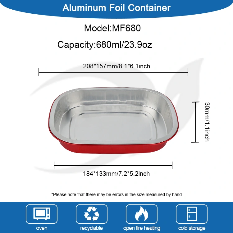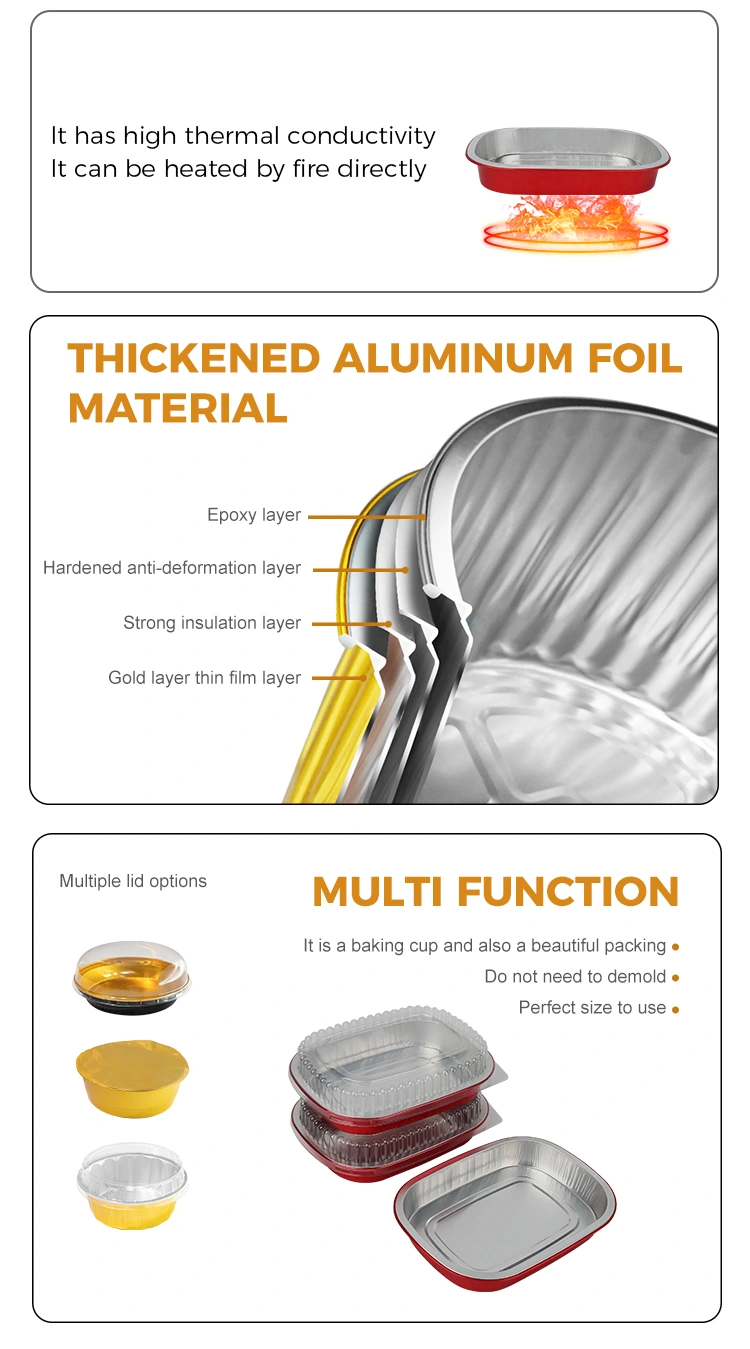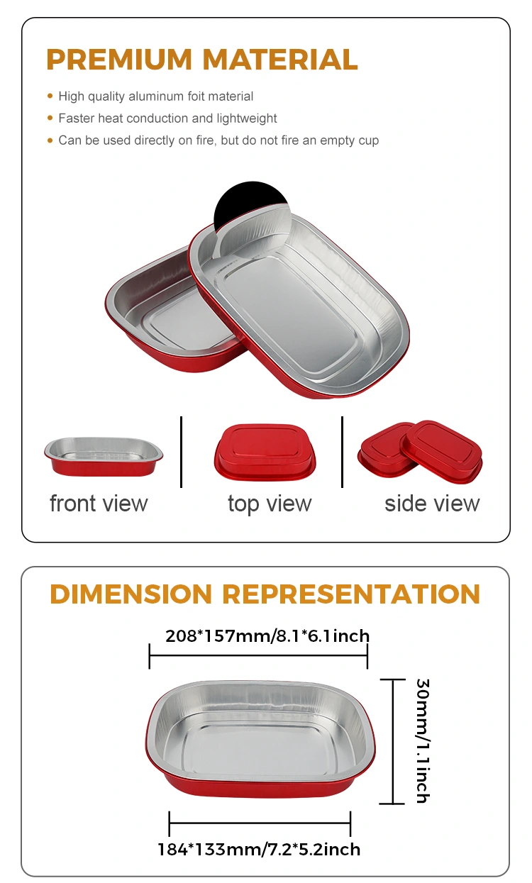 Yunchu, Çin'deki Alüminyum Folyo Kapların profesyonel üreticisi ve tedarikçisidir. Sizlere sunduğumuz Tek Kullanımlık kırmızı öğle yemeği kutusu kare Alüminyum Folyo Kaplar 208*157 milimetre (8,1*6,1 inç) çapındadır. Alt çap 184*133 (7,2*5,2 inç), yükseklik 30 (1,1 inç) ve kapasite yaklaşık 680 mililitredir (23,9OZ). Hem tokluğu hem de yük taşıma kapasitesini hesaba katan, deforme edilmesi veya sızması kolay olmayan ve doğrudan gıdayı destekleyebilen, gıda sınıfı 8011 gıda sınıfı alüminyum folyo kalınlaştırılmış taban malzemesini benimser. -20°C ile 220°C arası ultra geniş sıcaklık aralığıyla uyumludur. Kalıptan çıkarma gerekmez. Kullanım için doğrudan fırına, fritöze veya buharlı pişiriciye yerleştirilebilir ve ayrıca muhafaza için soğutulabilir. "Pişirme - depolama - tüketim - imha" konusunda tek elden kullanışlı bir deneyim sunar. Alüminyum folyonun temel avantajı yüksek ısı iletkenliğidir. Altın kaplama, ısının toplanmasına yardımcı olarak gıdanın eşit ve hızlı bir şekilde ısıtılmasını sağlar.