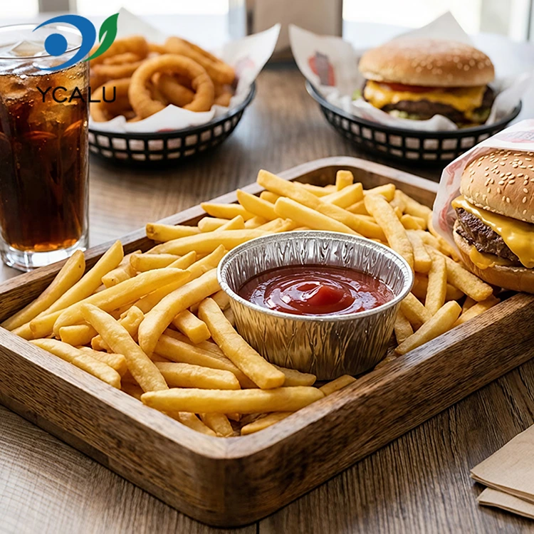 Yunchu Alüminyum Folyo Tedarikçisi Tek Kullanımlık Yuvarlak Sos Hava Fritözü Gümüş Alüminyum Folyo Kabı Gıda Sınıfı Alüminyum Folyo Malzemesi, kokusuz, ağır metal kalıntısı yok, gıdayla temas standartlarına, yüksek saflığa ve kararlı kimyasal özelliklere uygundur. Asitli soslarla doldurulup yüksek sıcaklıklarda ısıtılsa bile zararlı madde salmaz ve gıdayla doğrudan temasta kendinizi tamamen güvende hissedebilirsiniz. Ürün, FDA gıda sınıfı sertifikasını geçmiştir ve FDA 21 CFR ile ilgili standartları sıkı bir şekilde takip etmektedir; profesyonel geçiş testleri ve ağır metal tespitinden sonra, kurşun ve kadmiyum gibi zararlı maddelerin içeriği güvenlik eşiğinin çok altındadır ve nitelikler tamdır. İster ev ister ticari kullanım için gönül rahatlığıyla tercih edebilirsiniz. Etleri marine etmek için sosları, sebzeler için salata soslarını ve köfteleri daldırmak için sirkeli yemekleri porsiyonlara ayırmak için kullanın. Porsiyonlar boşa gitmeden tam olarak doğru. Ayrıca koku transferini de önleyebilir ve buzdolabında yer kaplamadan düzgün bir şekilde saklanabilir. Paket servis satıcıları bunu, mühürlü ve sızdırmaz sosları depolamak ve müşterilere temiz bir şekilde teslim etmek için kullanıyor. Ketçap, tatlı biber sosu veya kalın susam sosu olsun, yiyeceklerin sızması ve kirlenmesi gibi bir sorun yaşanmayacaktır. Açık havada piknik yapmak ve kamp yapmak için bile yanınızda birkaç tane getirebilir ve dip sosları saklamak için kullanabilirsiniz. Hafiftir ve yer kaplamaz. Kullandıktan hemen sonra çöpe atabilirsiniz. Eve bir sürü kirli kap taşımanıza gerek yok. Esas olarak kolaylık ve sorunsuzlukla ilgilidir.