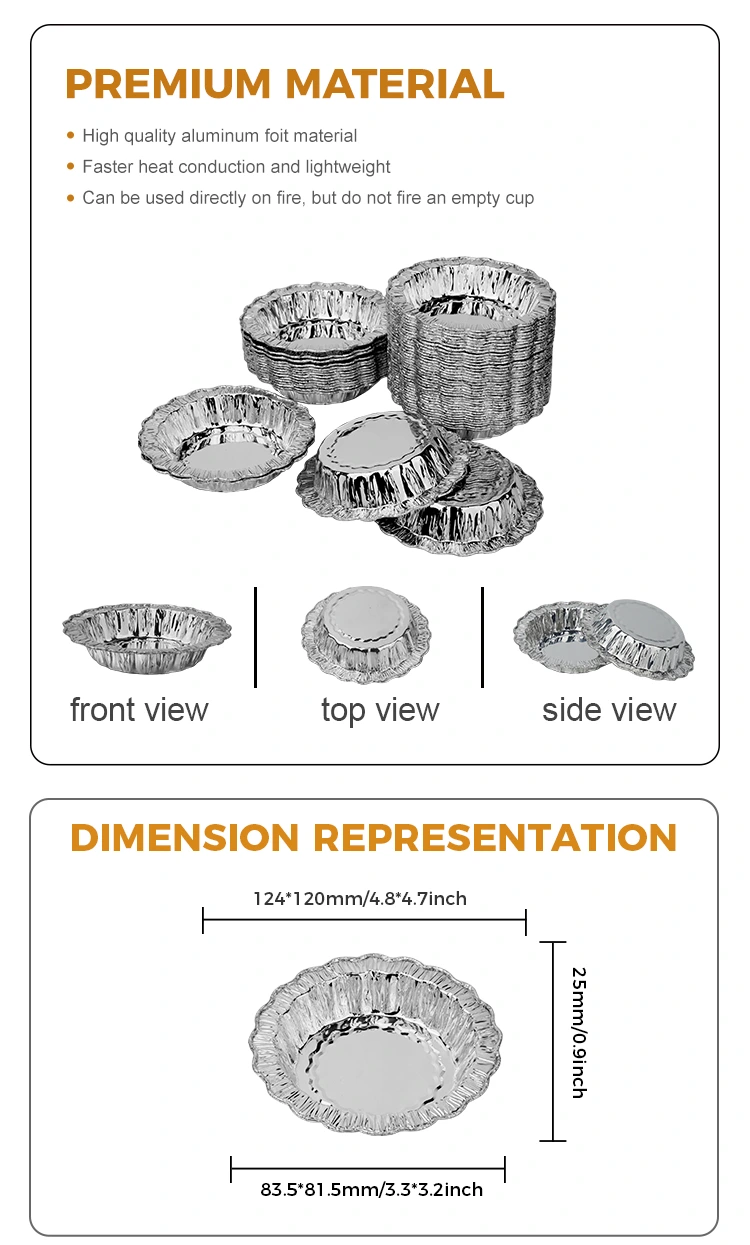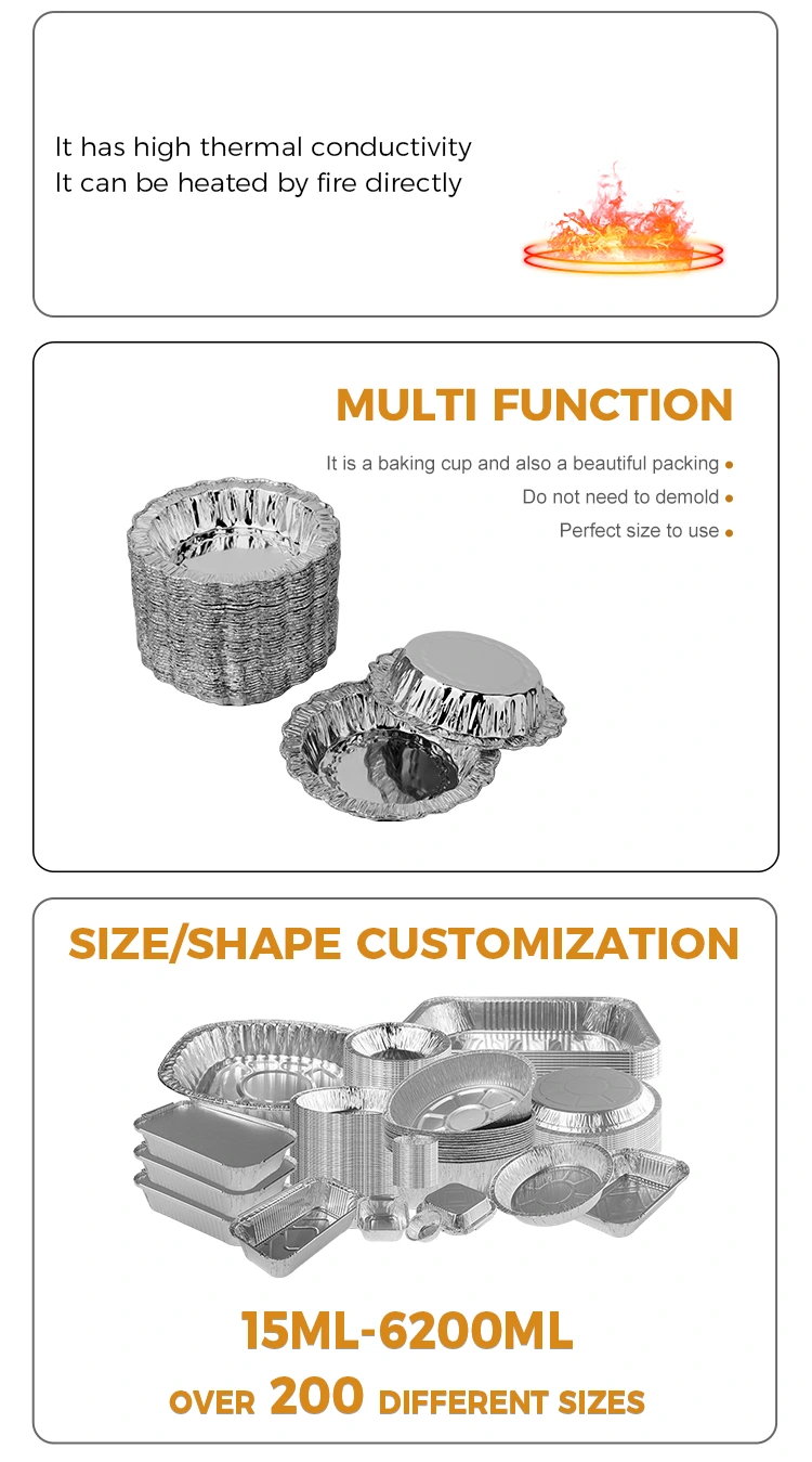 Yunchu Alüminyum Folyo size Dantel yuvarlak pişirme keki sağlar Gümüş Alüminyum Folyo Kapları pişirme ve buharda pişirme için çok yönlüdür. Birden fazla kullanım için tasarlanmıştır; kek, kase kek ve diğer çeşitli lezzetleri hazırlayabilir. Tek kullanımlıktır, temizlemeye gerek yoktur ve -30°C'den 250°C'ye kadar yüksek sıcaklıklara dayanabilir, yanmaz veya kırılmaz. Kalın, kaliteli, gıdaya uygun ve çevre dostu malzemelerden yapılmış olup, zararlı maddeler olmadan kullanılması daha güvenlidir. Hasara karşı dayanıklı, sağlam ve dayanıklı, güçlü çekme mukavemeti ve iyi uzama özelliğine sahip olup kenarları kesilmeleri önlemek için pürüzsüzdür. Farklı pişirme ihtiyaçlarını karşılamak için çeşitli özellikler mevcuttur.