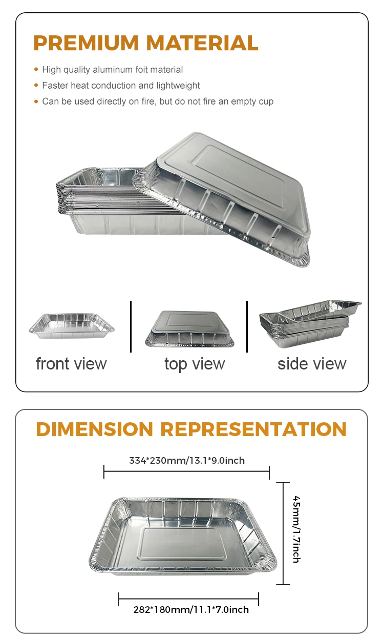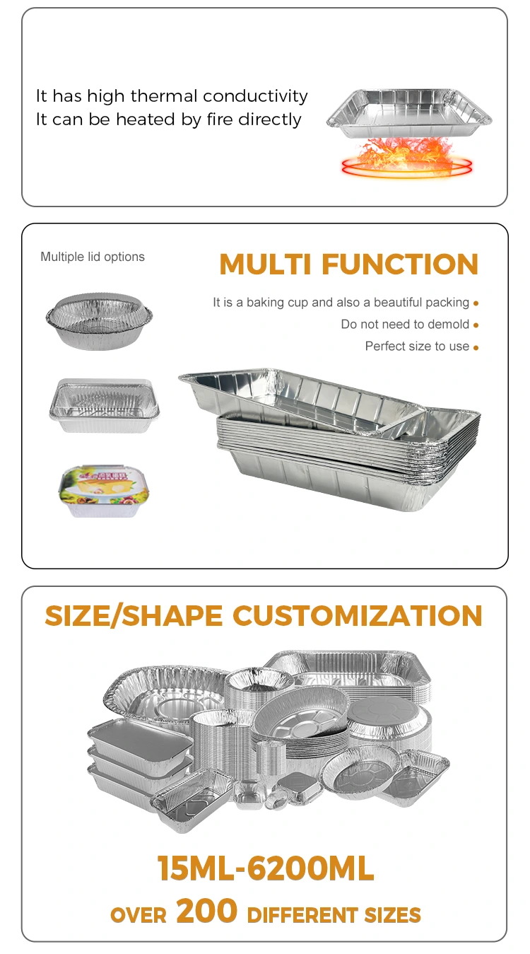 Yunchu alüminyum folyo tedarikçisi büyük ızgara balık paket servisi gümüş alüminyum folyo kaplar, hava fryerları, barbekü ızgaraları, rotisserie fırınları ve deniz ürünleri yapımı gibi çeşitli durumlar için uygun çeşitli pişirme ihtiyaçlarını karşılıyor. Bu alüminyum folyo kap, gıdaların pot duvarına dökülmesini ve yapışmasını etkili bir şekilde önlemek için yükseltilmiş bir kenar ile özel olarak tasarlanmıştır ve PAN astarını pratik ve endişesiz birden fazla katmanla korur. Gıda sınıfı 8011-0 malzemesinden yapılır, 520 ° C'ye kadar ısıya dayanıklı sıcaklık, yakılmamış veya kırılmamış ve kalınlaşmış malzeme deforme olmayı kolaylaştırmaz. Alüminyum folyo kutusu bir bütün olarak kalınlaşır, böylece kullanım sırasında deformasyon konusunda endişelenmeden pişirdikten sonra kolayca alabilirsiniz. Hemmed tasarım tutmayı rahatlatır ve kenarlar yuvarlanır, bu nedenle parmaklarınızı çizme konusunda endişelenmenize gerek yoktur. Pürüzsüz kenarlar, PET tamamen şeffaf kapaklar ve alüminyum folyo folyo kapakları ile tamamlanır, bu da onları çeşitli pişirme yöntemleri için daha uygun hale getirir.