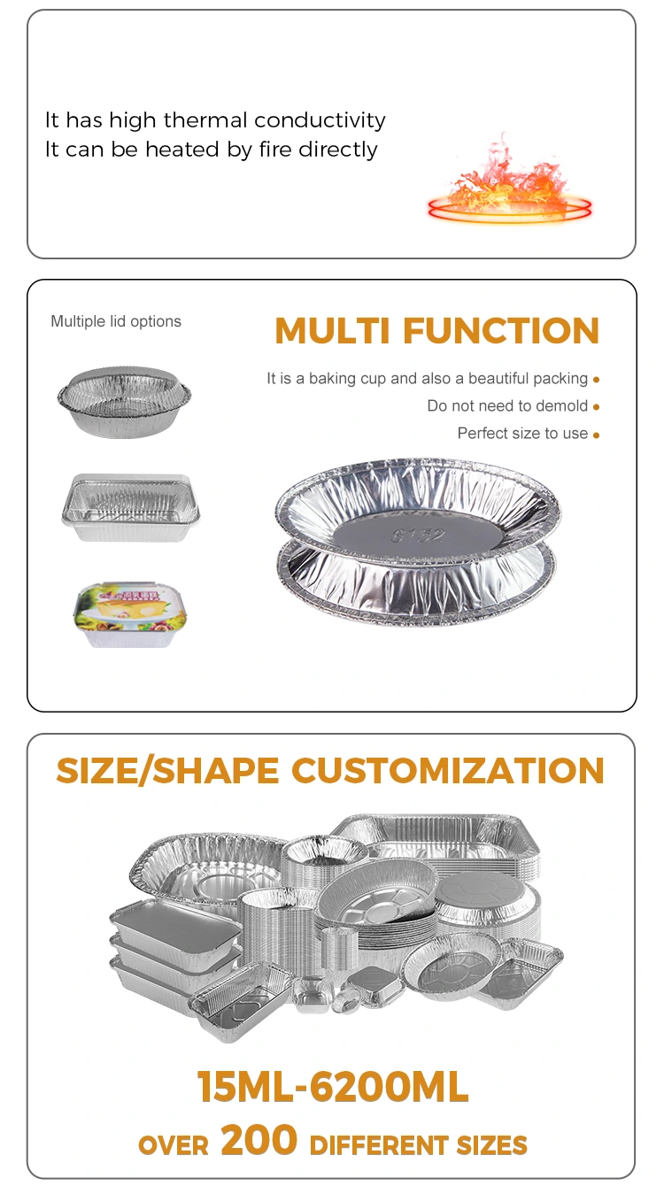 Özellikler: Tek parçalı kalıplama kalınlaşmış ve pişmiş dirençli, gıda temas derecesi alüminyum folyo malzemesinin benimsenmesi, gıda temas etmenin emin olması, deforme olması kolay ve sızıntı yapmaması, güçlü kalınlık, korozyon direnci, yüksek sıcaklık direnci.