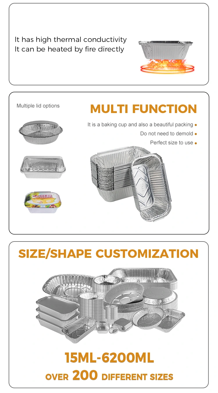 Özellikler: Sağladığımız alüminyum folyo öğle yemeği kutusu, mükemmel ısı koruma performansına sahip ve yiyeceklerin sıcaklığını etkili bir şekilde koruyabilen ve yiyeceklerinizi daha çekici hale getirebilen 8011 alüminyum folyo malzemeden yapılmıştır. Özellikle, dikdörtgen pişmiş pirinç gümüş alüminyum folyo kaplarımız sadece termal yalıtım özelliklerine sahip olmakla kalmaz, aynı zamanda logoların kişiselleştirilmiş özelleştirilmesini kolaylaştırmak ve marka farkındalığını arttırmak için alüminyum folyo kapakları veya PET plastik kapakları ile birleştirilebilir.