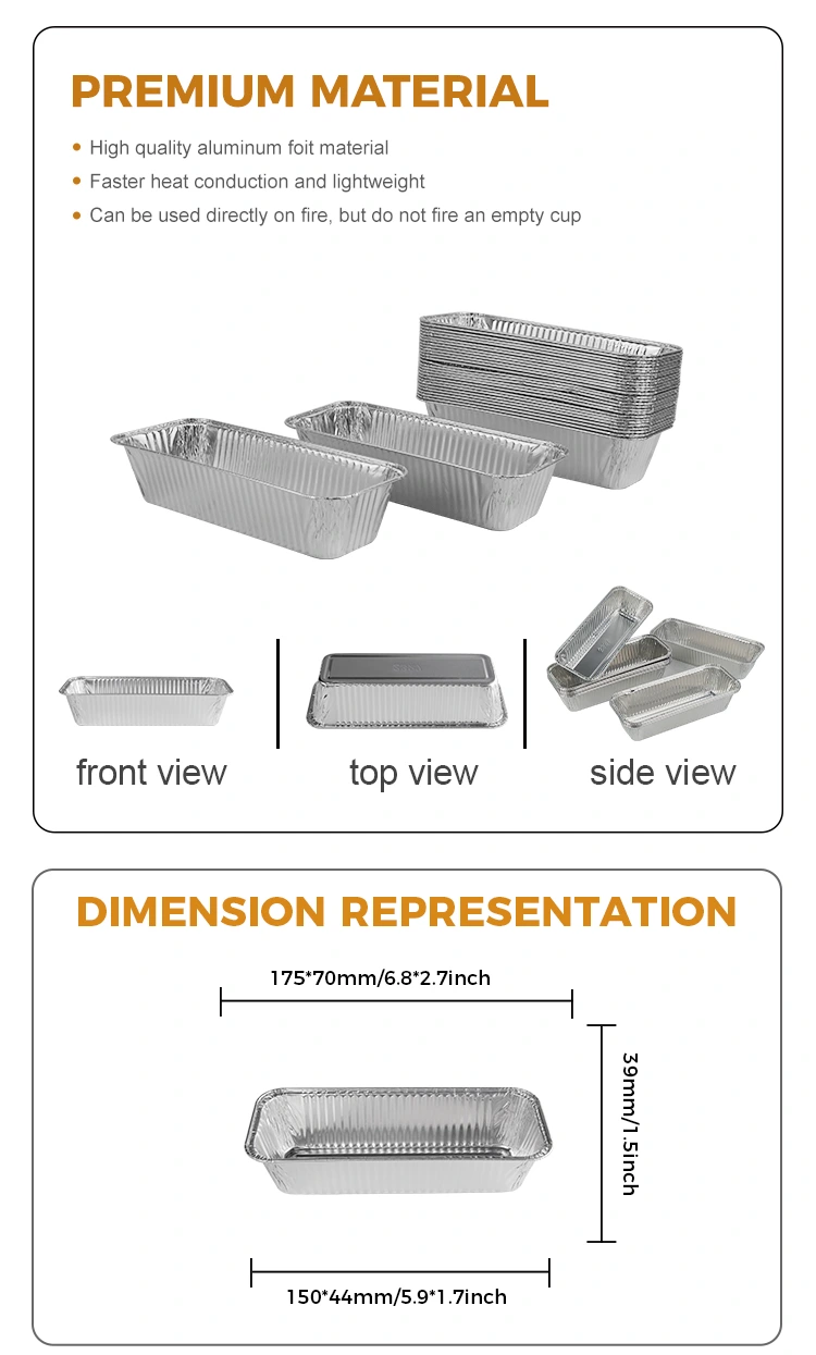 Özellikler: Dikdörtgen ekmek tepsisi gümüş alüminyum folyo kaplar sağlıklı ve çevre dostu, gıda sınıfı malzemeler, güvenli ve toksik olmayan, yenilenebilir ve çevre dostu malzemeler kullanarak, gıda güvenliğine odaklanarak ve genel ürün kalitesini takip etmek.