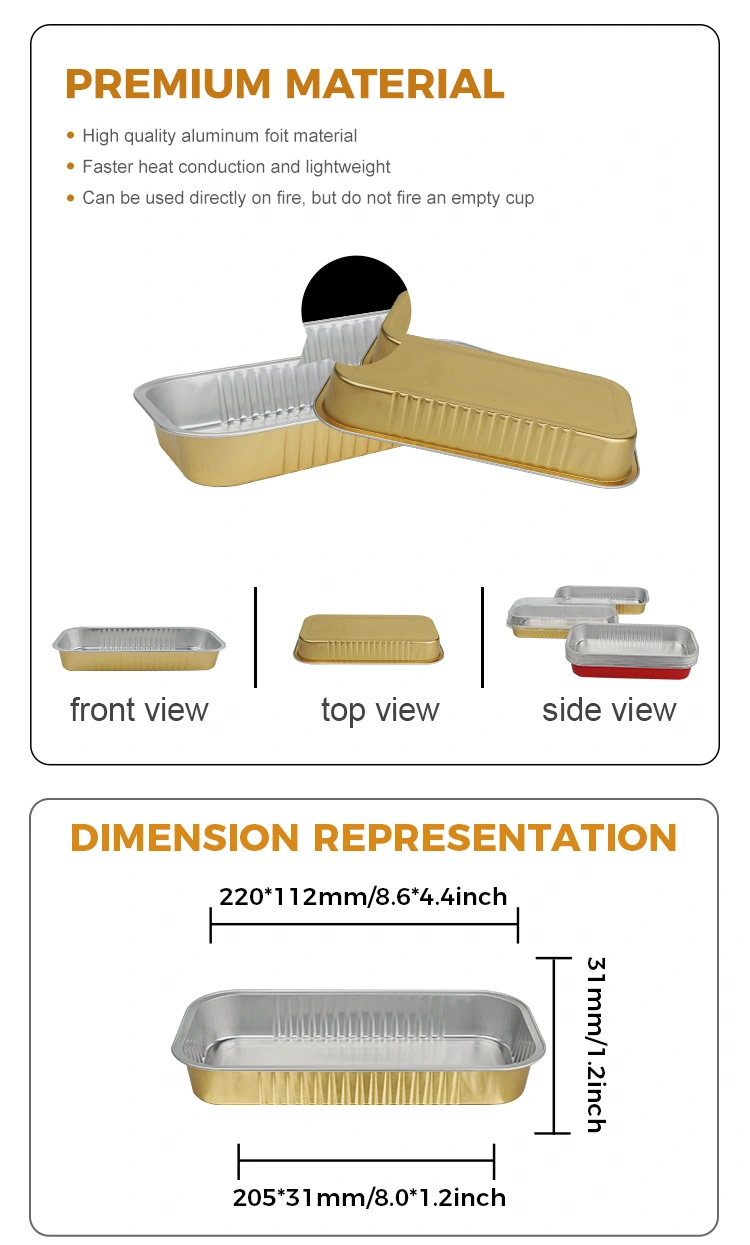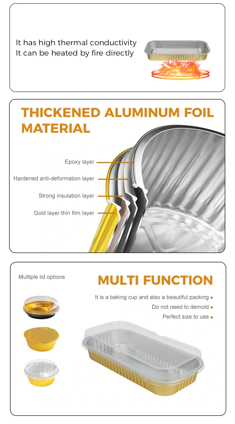 Dikdörtgen altın fırın Smoothwall Alüminyum Folyo Kapları, pişirme ve üretimden sunum, depolama ve teslimata kadar her lezzetli yemeğin kullanıcılara daha rafine ve daha güvenli bir şekilde ulaşmasını sağlayan "görünüm + dayanıklılık" gibi ikili avantajlara sahiptir. Bunu seçin, böylece pişirme işlemi yalnızca bir lezzet keyfi değil, aynı zamanda çok yönlü bir vizyon ve deneyim yükseltmesidir!