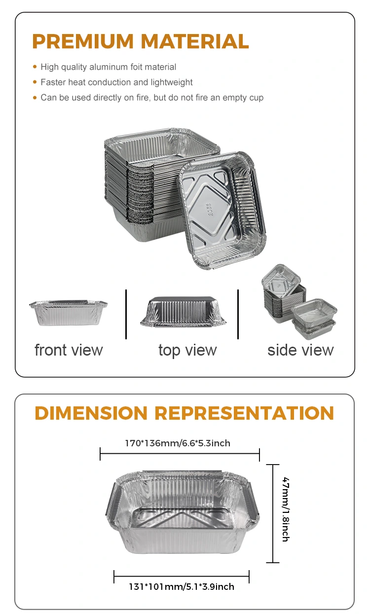 Made in China Model 2056 Dikdörtgen Gratin paketlenmiş gümüş alüminyum folyo kapları, 170*136 mm (5.1*5.3 inç), 131*101 mm (5.1*3,9 inç) taban çapı olan çok mütevazı bir boyuttur, sadece 47 mm (sadece 47 mm (1,8 mm) kapasitesi 620 mm.8 kapasitelidir. Bu boyutun taşınması kolay değil, aynı zamanda çeşitli farklı kullanım ihtiyaçlarını da karşılıyor.