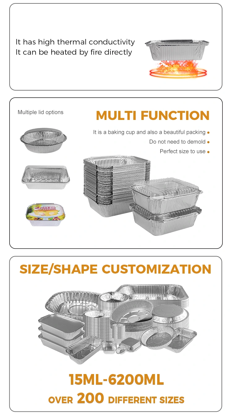 Yunchu Alüminyum Folyo Tedarikçisi Malzemesi Dikdörtgen Gratin Ambalaj Gümüş Alüminyum Folyo Konteyneri, hem hafif hem de dayanıklı olan yüksek kaliteli alüminyum folyo malzemesi kullanılarak mükemmeldir. Üst, bir evcil hayvan veya alüminyum folyo kapağı ile donatılmıştır ve altta, gıdaların güvenliğini ve hijyenini sağlamak için sıkılmış ve yan kutuya sabitlenmiş bir kapağı vardır. Bu güvenilir fiziksel özellikler ve kullanıcı dostu tasarım onları paket servisi için ilk tercih haline getirir.