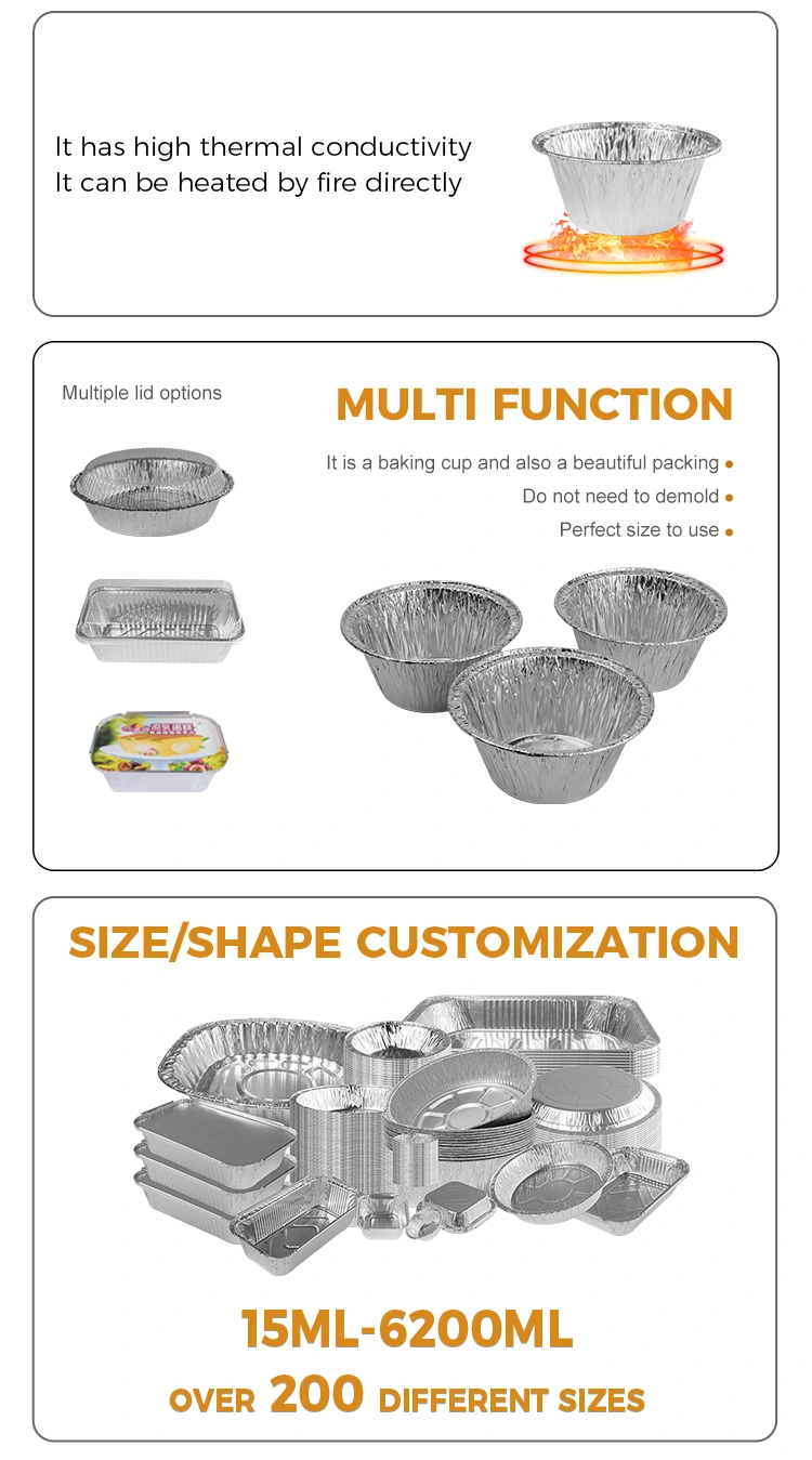 Özellikler: Yuvarlak Fırında Pasta Gümüş Alüminyum Folyo Gıda Konteyneri Sağlıklı ve Çevre Dostudur, Temizlenmesi Gerekmez, Çeşitli Evde Pişmiş Atıştırmalıklar yapmak için uygundur ve aynı zamanda fırınlar için olmazsa olmaz bir üründür, alüminyum folyo malzemesi güvenli ve hijyeniktir, temizlik, açık bir alev üzerinde pişirilebilir, gıda yapmak için uygundur.